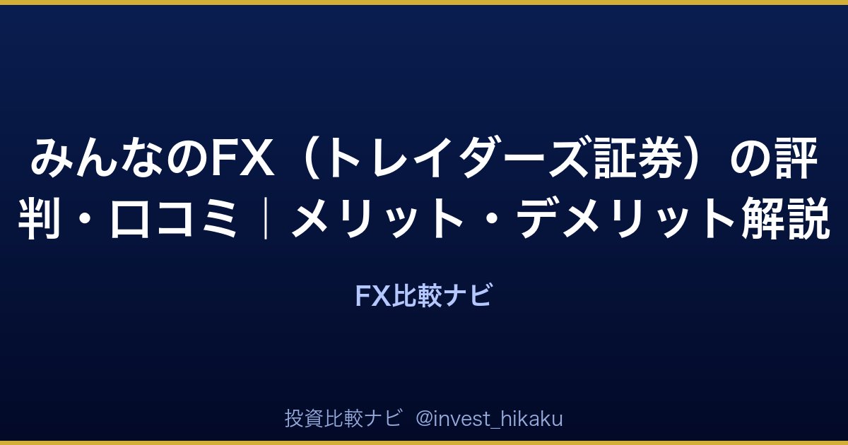 みんなのFX(トレイダーズ証券)は、業界最狭水準のスプレッドと使いやすいツールで人気のFX業者です。この記事では実際の口コミ・評判をもとに、メリット・デメリットを徹底解説します。